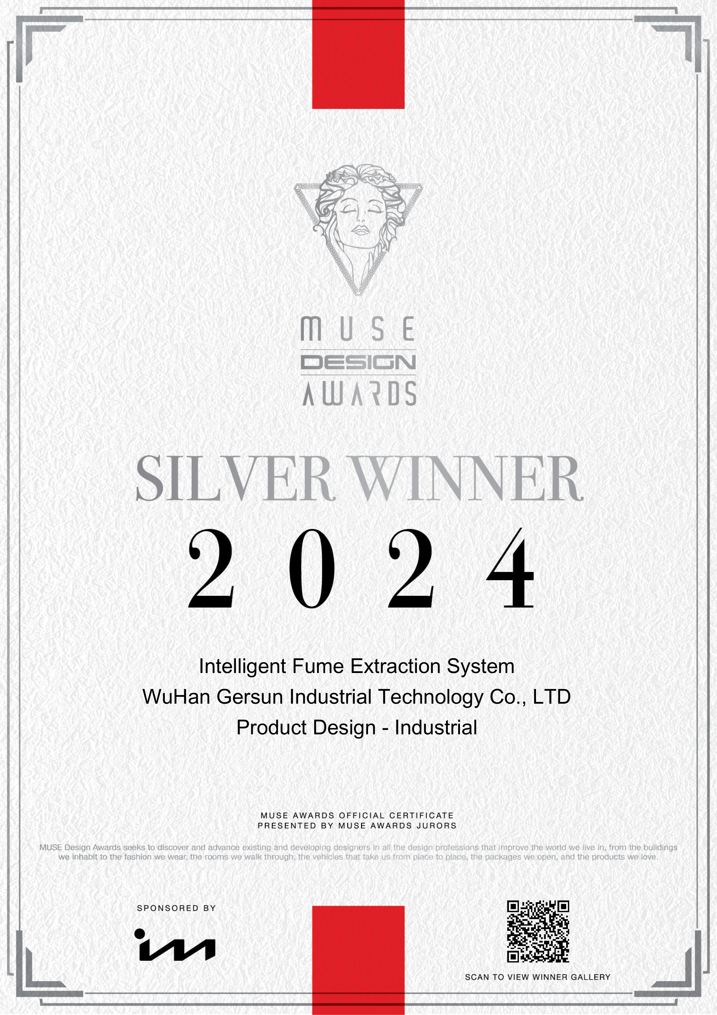 近日,2024年繆斯設計獎(MUSE Design Awards)公布2024年度的評選結果,武漢格晟工業技術有限公司自主研發生產的智能排煙系統(煙霧凈化器)在眾多國際參賽產品中脫穎而出榮獲銀獎。